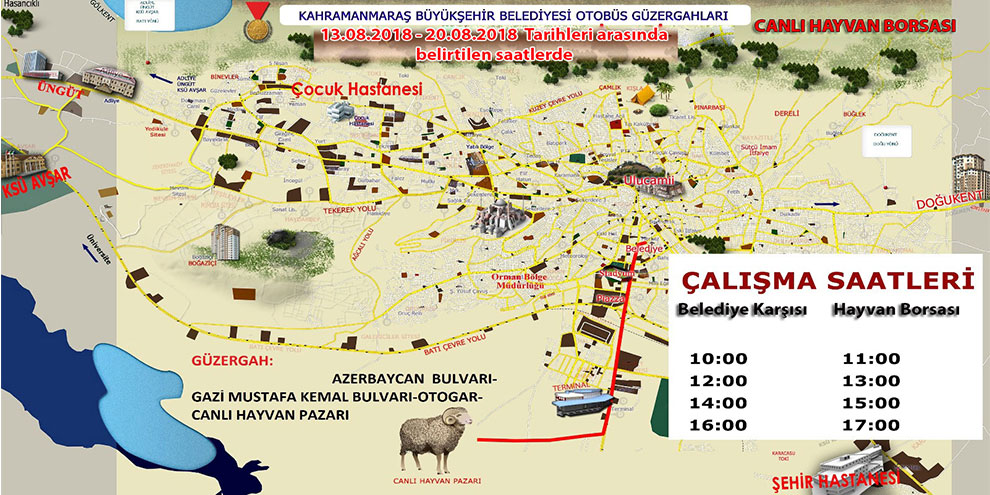 Kahramanmaraş Büyükşehir Belediyesi tarafından geçici süreli olarak çalışacak otobüs hattı 13 Ağustos 2018 Pazartesi günü başlayıp, 20 Ağustos 2018 Pazartesi gününe kadar devam edecek.
