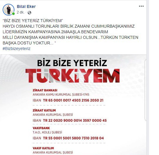 Eker, ‘Biz bize yeteriz Türkiyem’ dedi 2 maaşını bağışladı