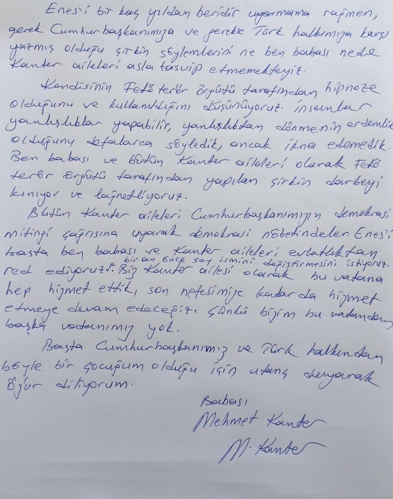 ''Enes'in FETÖ terör örgütü tarafından hipnotize olduğunu ve kullanıldığını düşünüyoruz.İnsanlar yanlışlıklar yapabilir. Yanlıştan dönmenin erdem olduğunu defalarca söyledik ancak ikna edemedik.Ben babası ve bütün kanter aileleri olarak fetö terör örgütü tarafından yapılan çirkin darbeyi kınıyor ve lanetliyoruz. Enes'i başta ben babası ve Kanter aileleri evlatlıktan reddediyoruz. Bir an önce soy ismini değiştirmesini istiyoruz.Başta Cumhurbaşkanımız ve Türk halkından böyle bir çocuğum olduğu için utanç duyarak özür diliyorum.''