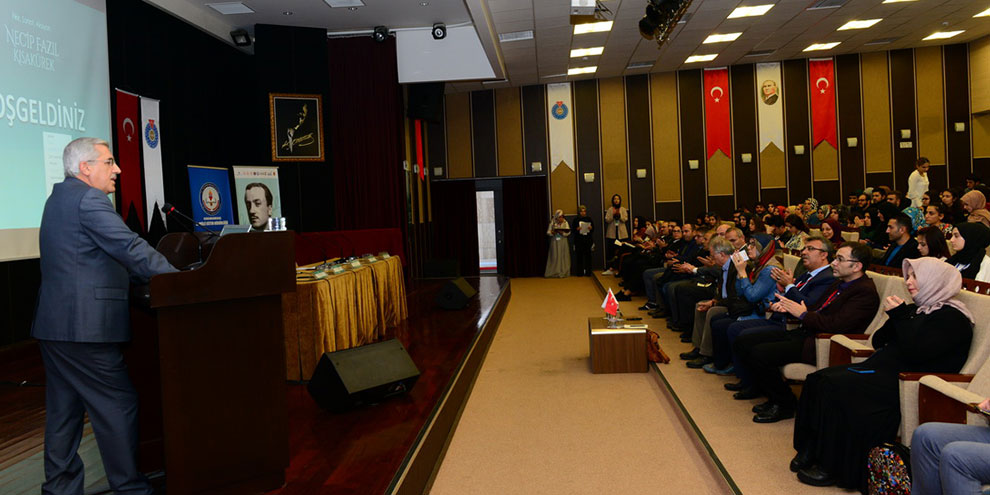 “Bu önemli çalışmanın artarak, büyüyerek dünyayı kuşatmasını gönülden diliyorum.” diyen Rektör Can, Necip Fazıl Kısakürek’in gençlik ve yaşamla ilgili önemli tespitlerini katılımcılarla paylaştı. Necip Fazıl Kısakürek’in sadece konuşan, tartışan değil düşündüklerini aksiyona dönüştüren bir gençlik hedeflediğini belirten Rektör Can, gençlere seslenerek “Hangi işi yapıyorsanız o işin hakkını verin. Bu ülkenin sıradan öğrencilere, öğretmenlere, doktorlara ihtiyacı yok, liyakatli ve donanımlı insanlara ihtiyacı var. Türk dünyası, İslam dünyası hatta insanlık, Türkiye’den çok şey bekliyor. Yalnızca slogan ve söylemlerle bu ihtiyaca cevap vermek mümkün değil. Harekete geçme, üretme ve ilerleme zamanıdır.” dedi.