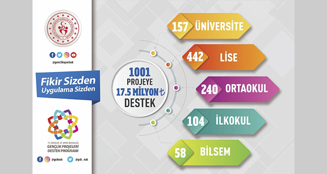 Gençlik ve Spor Bakanlığı tarafından “Fikir sizden uygulama sizden” sloganıyla yürütülen Gençlik Projeleri Destek Programı kapsamında 2019-I özel çağrısı sonuçlanarak, desteklenecek projeler belirlendi. Farklı alanlarda yapılan başvurulardan seçilen 1001 projeye 17,5 milyon lira destek sağlanacak. 9-30 Kasım tarihleri arasında alınan başvurulara gençler yoğun ilgi göstererek, geçen yıla göre 7 kat fazla başvuruda bulundu. Değerlendirme sonucunda gönüllülük, kültür ve sanat, fiziksel aktivite, egzersiz ve spor, yenilikçi fikirler, çevre bilinci ve hayvanların korunması başlıklarında sunulan 1001 projeye 17,5 milyon TL destek verilmesi kararlaştırıldı. Gençlerin beklenti ve ihtiyaçları da dikkate alınarak tasarlanan 2019-I özel çağrısının kapsamına ilk defa ilkokul ve ortaokullar ile bilim ve sanat merkezleri dahil edildi. Resmi okulların yanı sıra program özel okulları da kapsayacak şekilde genişletildi.