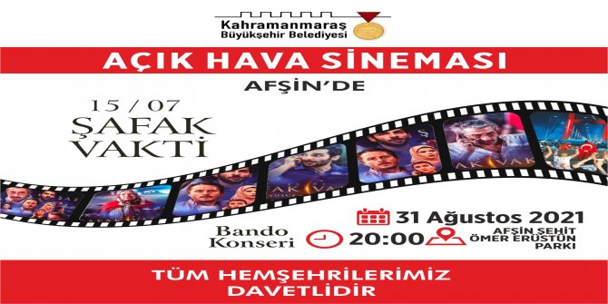 Kahramanmaraş Büyükşehir Belediyesi tüm ilçelerde Açık Hava Etkinlikleri düzenliyor. Programlar kapsamında Büyükşehir Belediyesi Bando Takımı konseri ve Şafak Vakti filminin gösterimi yapılacak. Ücretsiz etkinliklerle, 15 Temmuz’da yaşanan milli direnişi konu edinen Şafak Vakti adlı film vatandaşların beğenisine sunulmuş olacak. Belirlenen takvime göre ilk etkinlik 23 Ağustos Pazartesi günü Türkoğlu Millet Meydanı’nda gerçekleştirilecek. Program kapsamında 19.00’da Büyükşehir Belediyesi Bando Takımı performansının ardından 20.00’da Şafak Vakti filmi açık havada seyirciyle buluşacak. Gerçekleştirilecek etkinlik ile ilgili olarak Büyükşehir Belediyesi Kültür Turizm ve Spor Dairesi Başkanlığı tarafından yapılan açıklamada ücretsiz etkinliklere tüm vatandaşların davet edildiği belirtildi.