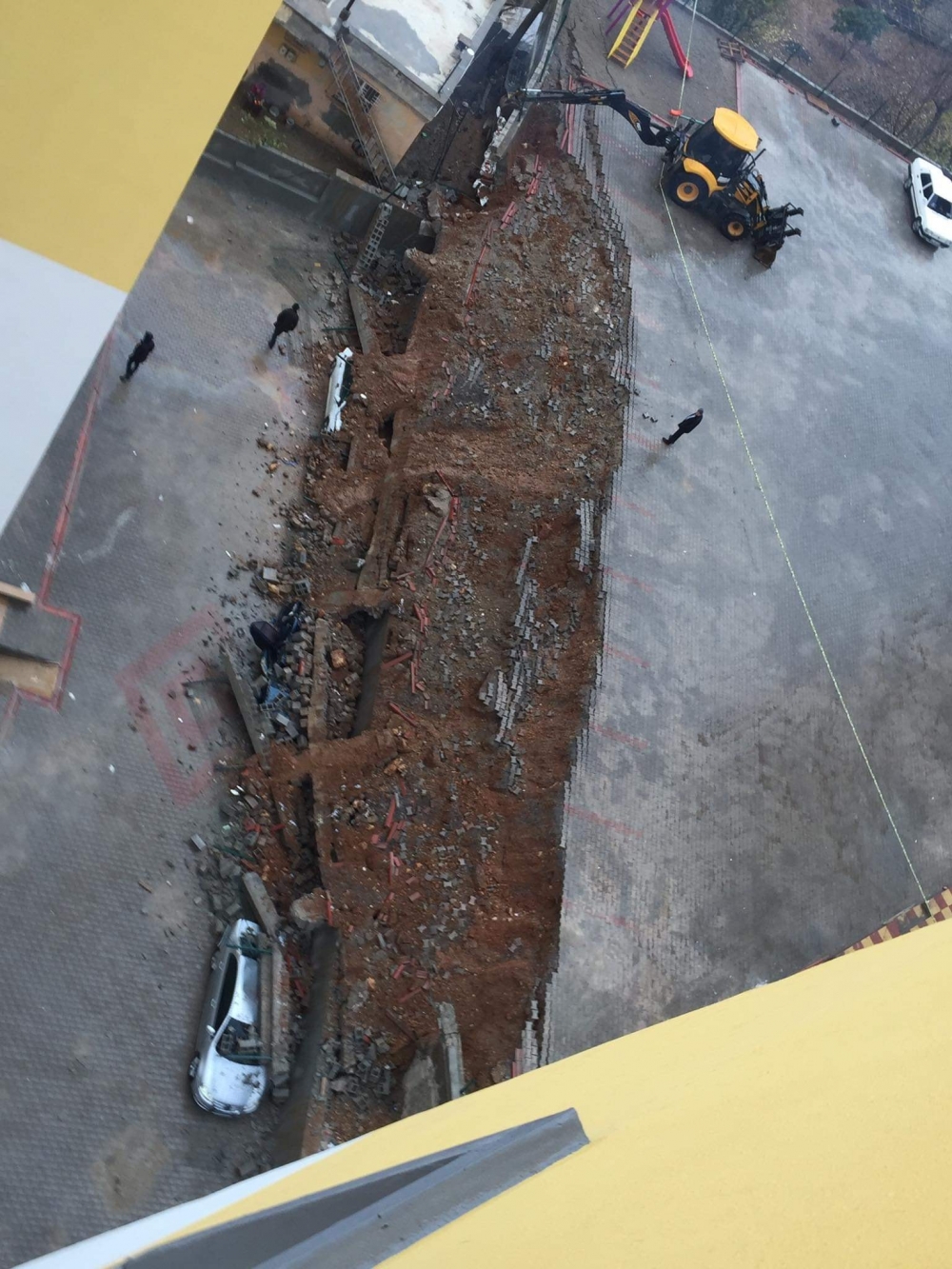 Çökme sırasında istinat duvarının yanına park edilmiş 3 otomobil hurdaya döndü.