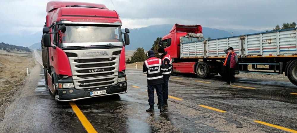 Yük taşımacılığı yapan araçlarda kar lastiği ve takograf kontrolü yapan jandarma trafik ekipleri, hareket halinde radar hız kontrolüyle hız yapan sürücüleri tek tek tespit ediyor. ​​​​​​​