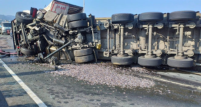 Trabzon’un Sürmene ilçesinde hamsi yüklü tırın yol kenarında duran bir başka tıra arkadan çarpması sonucu meydana gelen kaza sonrasında yola kasalarca hamsi devrildi.