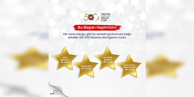 Kipaş Holding büyük bir başarılarını devam ettirerek 2020 yılı İstanbul Sanayi Odasının açıkladığı İSO 500 listesinde bir şirketi ilk yüzde olma üzere, toplamda 4 şirketi ile yer aldı.