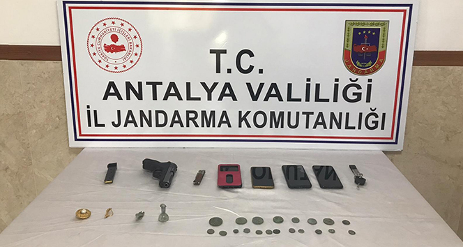 Manavgat İlçe Jandarma Komutanlığı ekiplerinin dün gerçekleştirdiği operasyonda gözaltına alınan şüphelilerin gösterdikleri yerlerde yapılan aramada, tamamı bin 400 yıllık olduğu değerlendirilen altın işlemeli heykel figürü, altın küpe, tarihi obje, gözyaşı şişesi ve sikke olmak üzere toplam 24 parça tarihi eser, ruhsatsız tabanca ve tabancaya ait 14 adet fişek ele geçirildi.
