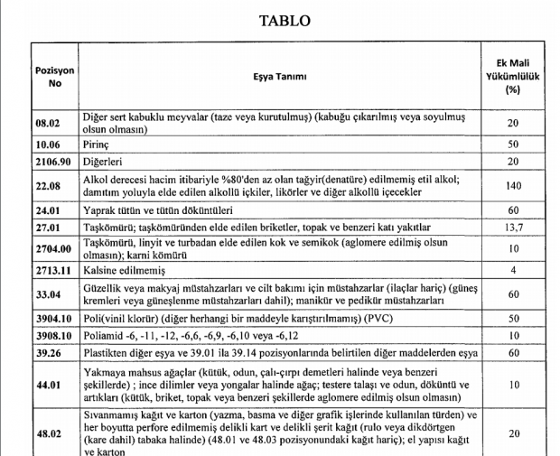 Diğer sert kabuklu meyveler (taze veya kurutulmuş, kabuğu çıkarılmış veya soyulmuş olsun olmasın) yüzde 20, pirinç yüzde 50, diğerleri yüzde 20, alkol derecesi hacim itibarıyla yüzde 80'den az olan tağyir (denatüre) edilmemiş etil alkol; damıtım yoluyla elde edilen alkollü içkiler, likörler ve diğer alkollü içecekler yüzde 140, yaprak tütün ve tütün döküntüleri yüzde 60, taş kömürü; taş kömüründen elde edilen briketler, topak ve benzeri katı yakıtlar yüzde 13,7, taş kömürü, linyit ve turbadan elde edilen kok ve semikok (aglomere edilmiş olsun olmasın); karni kömürü yüzde 10, kalsine edilmemiş yüzde 4, güzellik veya makyaj müstahzarları ve cilt bakımı için müstahzarlar (ilaçlar hariç, güneş kremleri veya güneşlenme müstahzarları dahil); manikür ve pedikür müstahzarları yüzde 60, poli (vinil klorür, diğer herhangi bir maddeyle karıştırılmamış, PVC) yüzde 50, poliamid -6, -11, -12, -6,6, -6,9, -6,10 veya -6,12 yüzde 10, plastikten diğer eşya ve 39.01 ila 39.14 pozisyonlarında belirtilen diğer maddelerden eşya yüzde 60, yakmaya mahsus ağaçlar (kütük, odun, çalı-çırpı demetleri halinde veya benzeri şekillerde); ince dilimler veya yongalar halinde ağaç; testere talaşı ve odun, döküntü ve artıkları (kütük, briket, topak veya benzeri şekillerde aglomere edilmiş olsun olmasın) yüzde 10, sıvanmamış kağıt ve karton (yazma, basma ve diğer grafik işlerinde kullanılan türden) ve her boyutta perfore edilmemiş delikli kart ve delikli şerit kağıt (rulo veya dikdörtgen -kare dahil- tabaka halinde), (48.01 ve 48.03 pozisyonundaki kağıt hariç); el yapısı kağıt ve karton yüzde 20, birincil elyaf (kraft) kağıt ve kartonları (kuşe edilmemiş, sıvanmamış, rulo veya tabaka halinde, 48.02 ve 48.03 pozisyonundakiler hariç) yüzde 20, kağıt, karton, selüloz vatka ve selüloz liften tabakalar (sıvanmış, emdirilmiş, kaplanmış, yüzeyleri boyanmış, yüzeyleri dekore edilmiş veya baskı yapılmış, her boyutta rulo veya dikdörtgen -kare dahil- tabaka halinde, 48.03, 48.09, 48.10 pozisyonundakiler hariç) yüzde 50, suni filament demetleri selüloz asetattan olanlar yüzde 60, diğerleri yüzde 60, diğer santrifüj pompalar yüzde 20, diğerleri yüzde 20, binek otomobilleri ve esas itibarıyla insan taşımak üzere imal edilmiş diğer motorlu taşıtlar (87.02 pozisyonuna girenler hariç, steyşın vagonlar ve yarış arabaları dahil) yüzde 120, diğer amaçlarla kullanılanlar yüzde 10. Bu kararın yayımı tarihinden önce Türkiye'ye sevk edilmek üzere bir taşıma belgesi düzenlenerek yüklemesi yapılmış eşyanın, bu kararın yayımı tarihinden itibaren en geç 45 gün içinde ithalatına ilişkin gümrük beyannamesinin tescili veya gümrük mevzuatı çerçevesinde özet beyanın verilmesi dahilinde, bu değişiklik kararından önceki ek mali yükümlülük oranları uygulanacak.