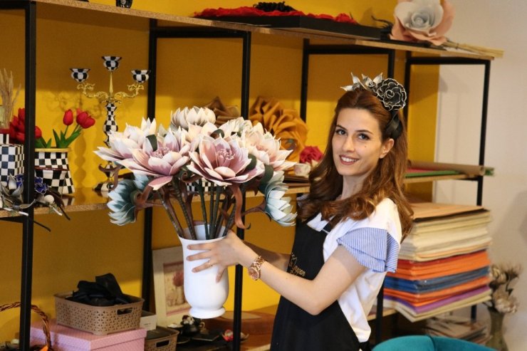 Kahramanmaraş'ta girişimci bir kadını, kurduğu atölyede dekoratif dev çiçekler yapıyor.