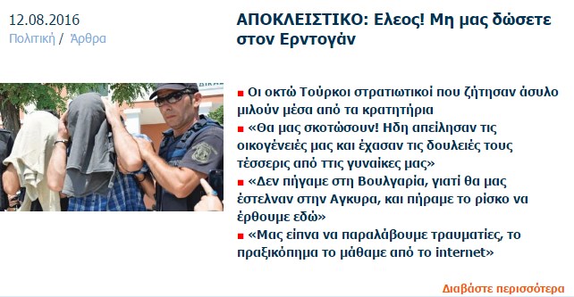 15 Temmuz'da yaşanan darbe girişiminden bir gün sonra, askeri helikopterle Yunanistan’ın Dedeağaç (Aleksandrupolis) şehrine kaçan 2’si binbaşı, 4’ü yüzbaşı, 2’si de başçavuş 8 asker, Türkiye’ye iade edilmeleri halinde idam cezasının ilk olarak kendilerine uygulanacağını söyleyerek "Bizi göndermeyin" dedi.